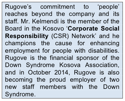 When asked to reflect on the very rapid growth of Rugove, Mr Kelmendi highlights his personal approach to business development and management. “I had the vision of where the company should go, but I realised that I needed external experts with specific subject skills to help us get there”. For Mr Kelmendi, a company that is too conservative in its management style and blocks new learning will sooner or later be overwhelmed by a market it does no longer understand. “Too many company owners in Kosovo have not yet realised that they must open up to new ideas, new ways of organising and managing the company, and external advise in order for their companies to change and grow.”